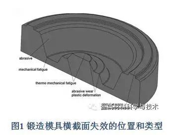 图1给出了一些特别退化机制发生区域在横截面上的位置。在平坦的区域,在工具和热材料变形过程中接触的时间是最长的,也是最大压力出现的地方,热机械疲劳是主要的退化机制。