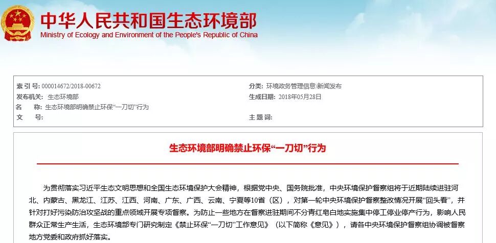 最近,生态环境部还专门发出通知,禁止环保“一刀切”行为。文件强调,严格禁止“一律关停”“先停再说”等敷衍应对做法,坚决避免集中停工停业停产等简单粗暴行为。